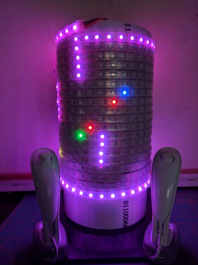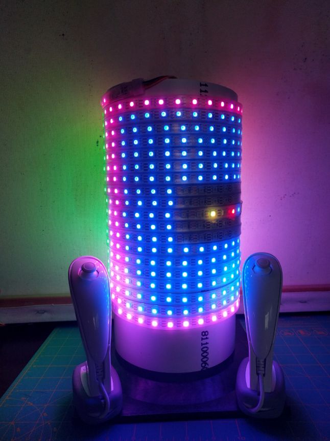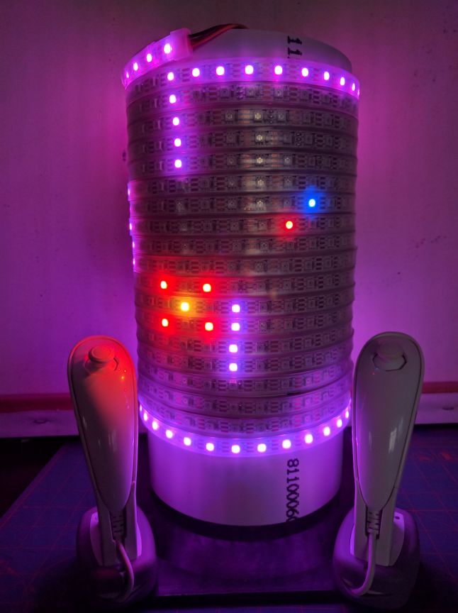 Imagine if you took a monitor, curved it into a cylinder, and lowered the resolution by a lot. Now add wireless Wii nunchuk controllers, and move your glowy avatar around with friends!