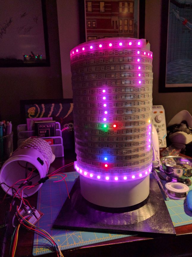 A large section of PVC tubing, a plastic base, the Particle Photon, and Teensy 3.2 boards respectively, a strip of 600 RGB LEDs, a speaker, four Wii nunchuks, and four wireless adaptors for those controllers. I’m sure there are other parts, but that gets you most of the way there.