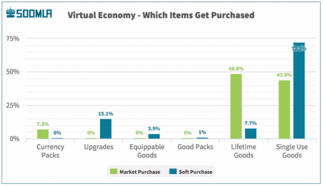 As for what exactly those players are buying, the report found that 71 percent of all purchases – that’s purchases made with both in-game and real world currency – are single-use items, while upgrades and lifetime goods are the second and third most popular items respectively.