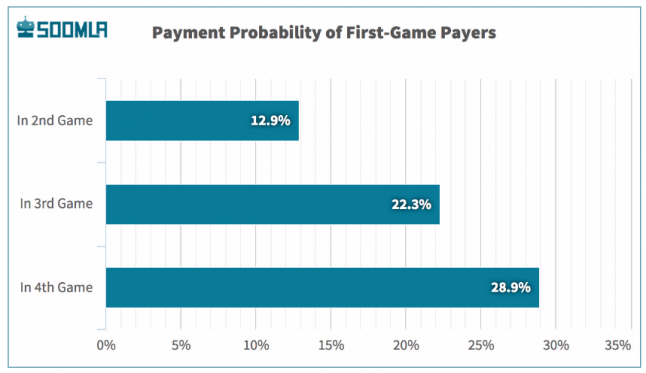 As the top graph below shows, that payment probablity only increases as “first-game payers” continue to spend in successive games.
